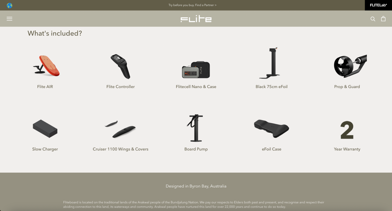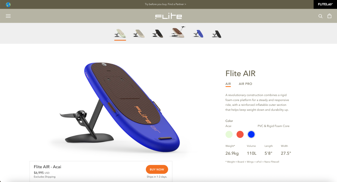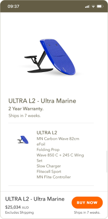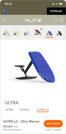 Fliteboard offers highly customisable eFoils with multiple product variants, allowing users to create their perfect ride by selecting board type, material, finish, battery, wings, and propulsion system. Since not all variants are compatible with every board type, Fliteboard needed a simple, user-friendly custom board configurator to streamline the selection process.
