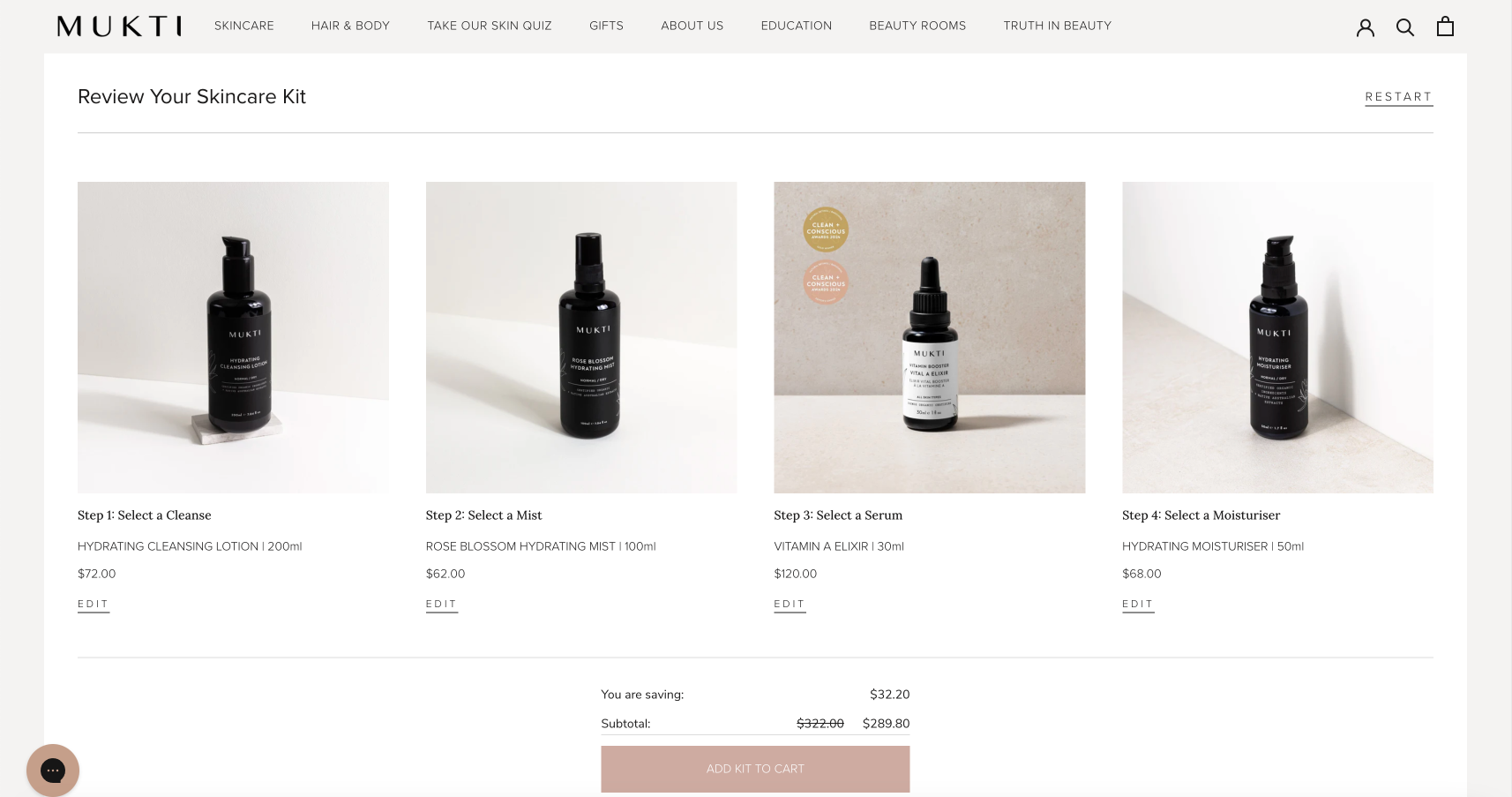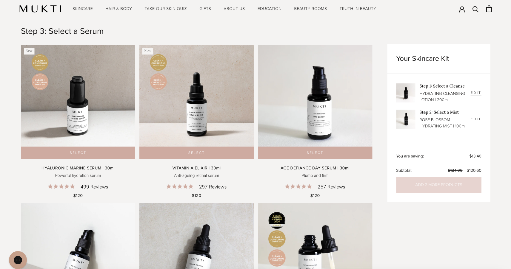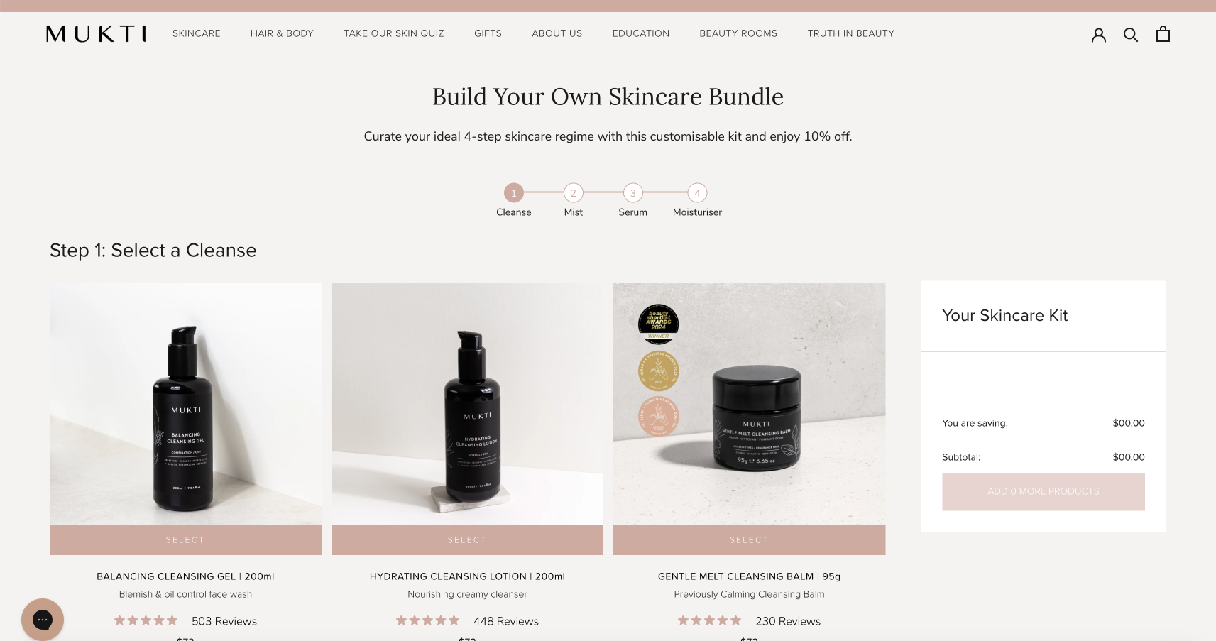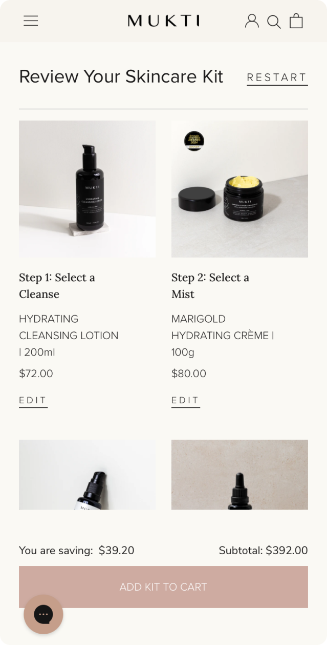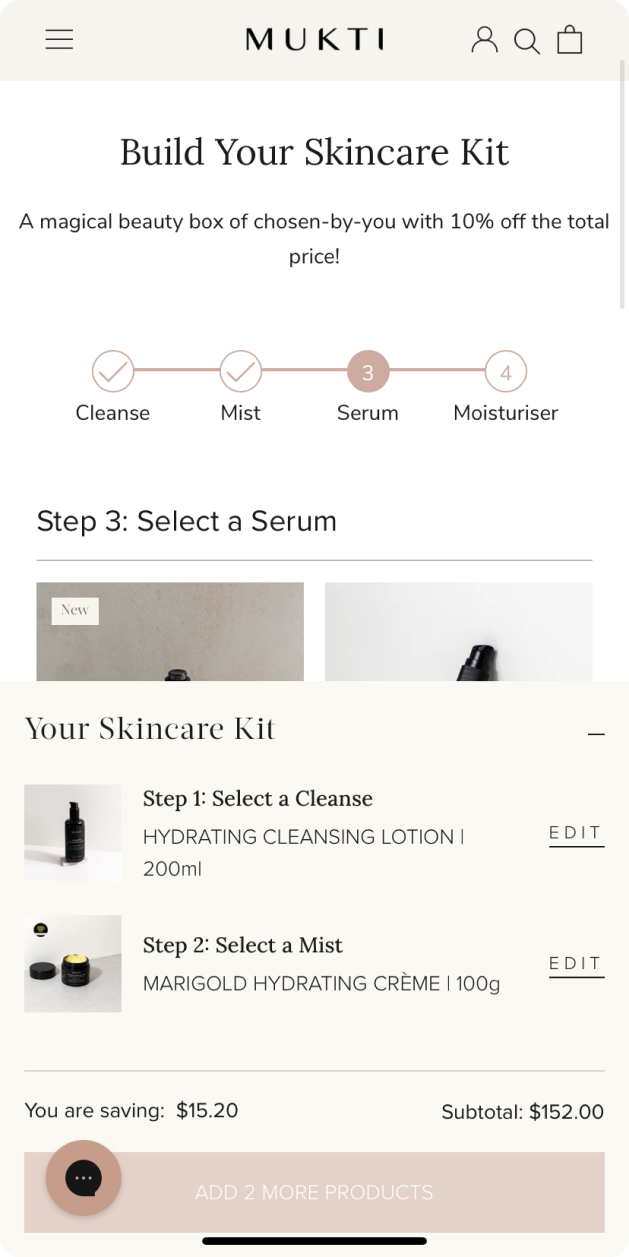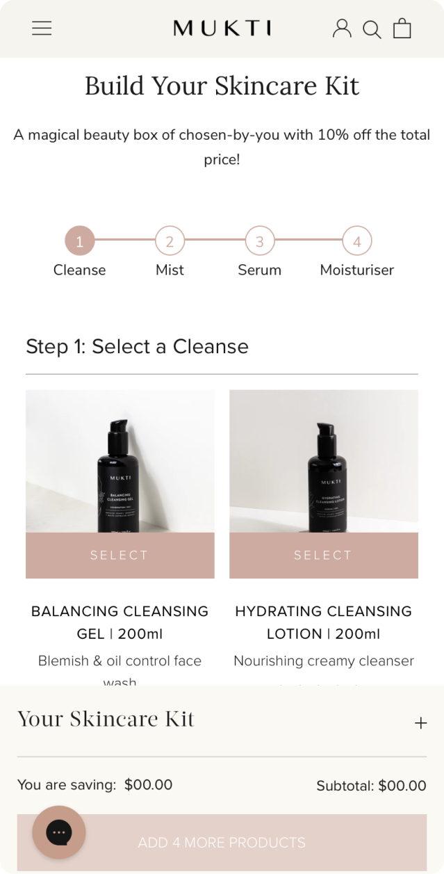 Mukti Organics wanted a new functionality that would allow customers to create their own customised skincare bundles. The goal was to offer customers the ability to select from specific product categories—such as cleansers, mists, serums, and moisturisers—and personalise their skincare routine. Additionally, the Mukti team needed an easy way to manage which products were available for bundling to provide a dynamic shopping experience.