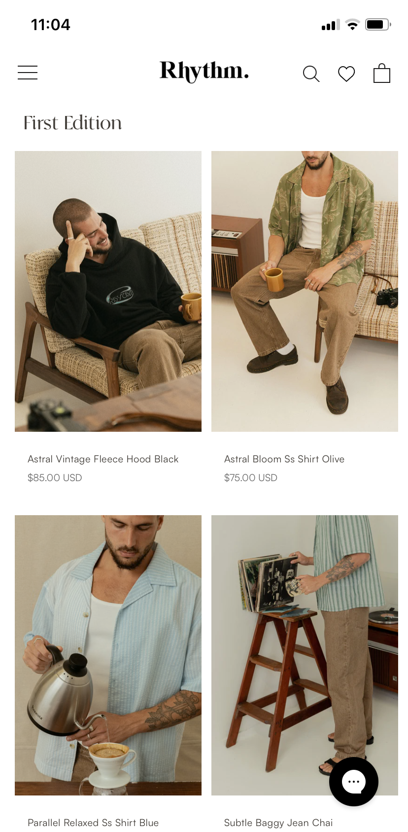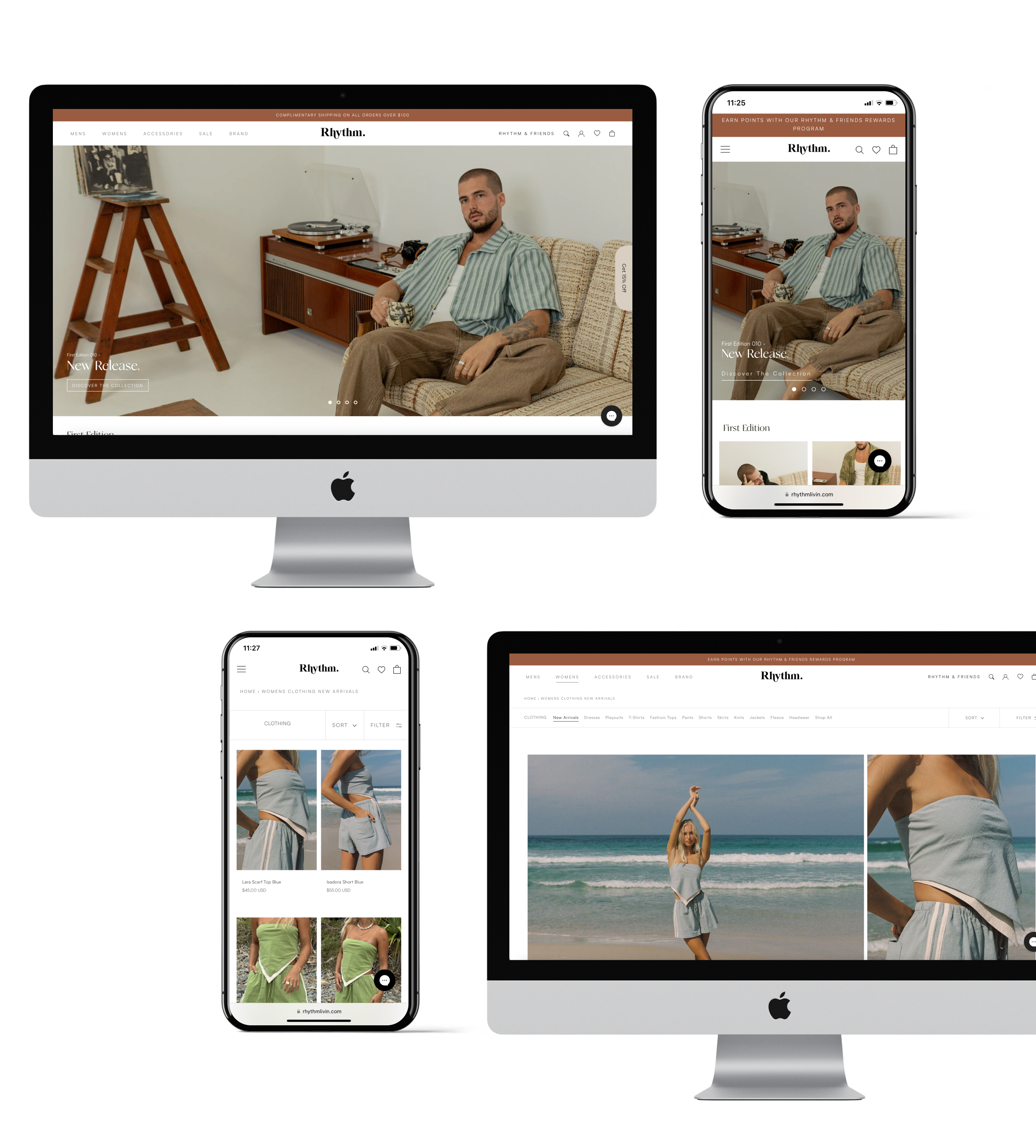 Rhythm was looking for a retheme and refresh of their current site with the key focus of this project to lift and elevate the brand experience as well as the user experience, in a way that removed the current conversion barriers and make Rhythm more competitive in a saturated fashion market.