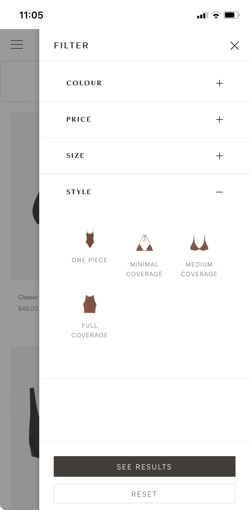 To achieve this our first goal was to improve user flows and navigation, implement an elevated and bespoke UI to create more editorial feel to the site, and improve key functionality such as filtering and size guides throughout the site.