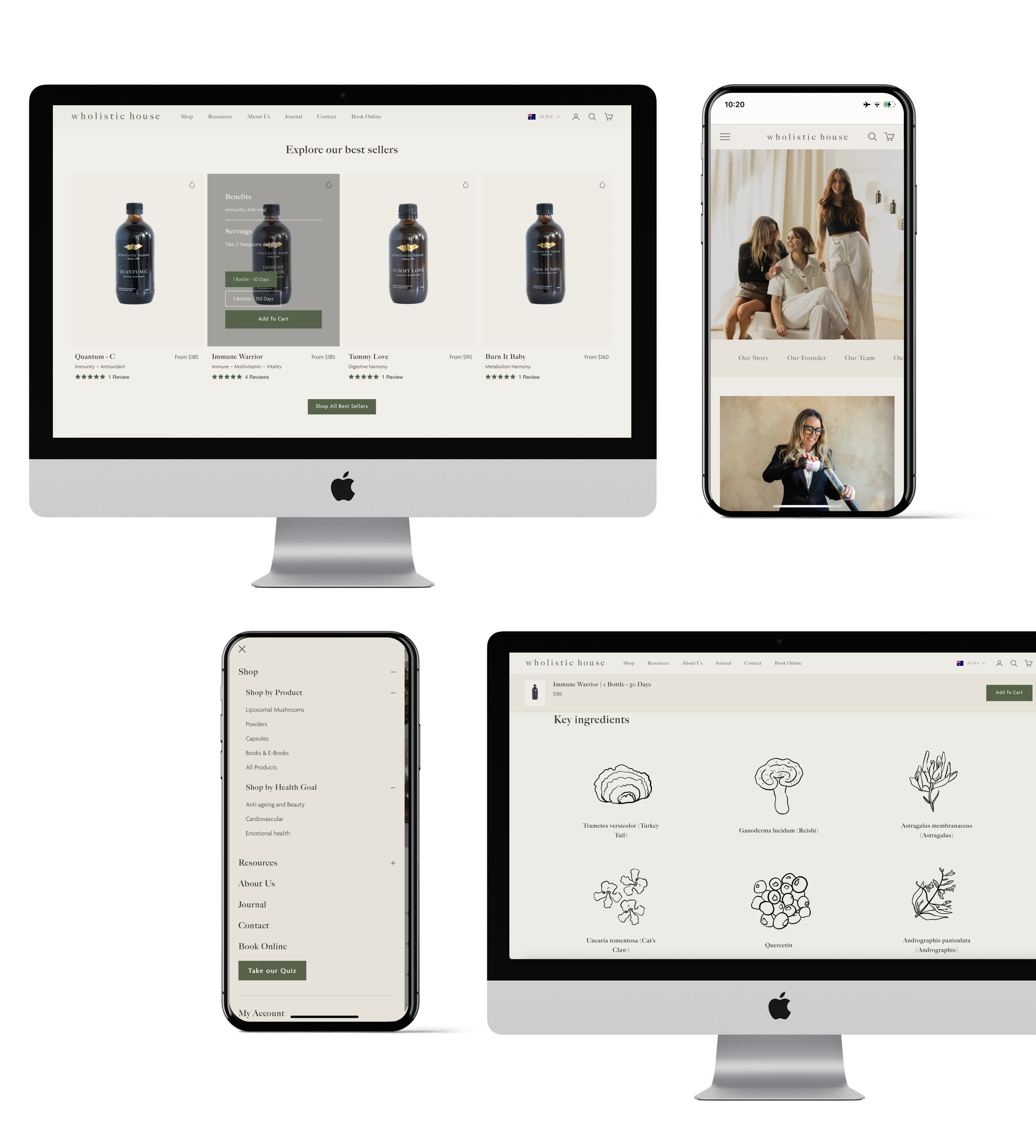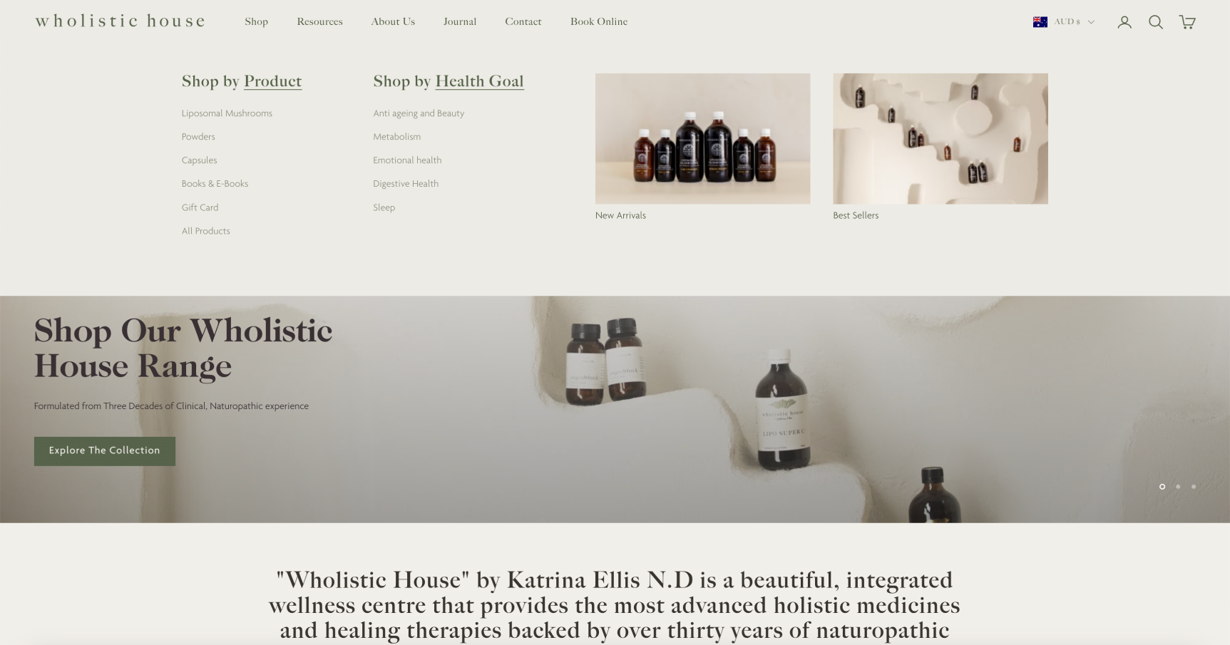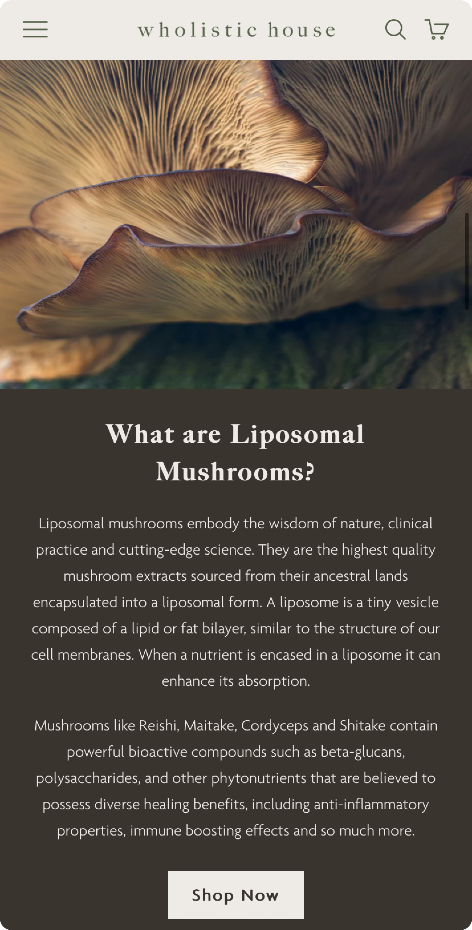 Wholistic House, led by Katrina Ellis N.D., seeks to transform their online presence to better reflect their brand's ethos of natural, organic, and high-quality wellness solutions. With over 30 years of clinical experience, Katrina’s reputation drives customer trust and loyalty. However, their current website’s clunky shopping process—with limited payment options like PayPal and Afterpay—hinders conversions. The goal is to modernise the website’s design and functionality, making it a streamlined, user-friendly platform that resonates with their audience and showcases their Australian-made products. By enhancing the online shopping experience, Wholistic House aims to reach a broader market and increase sales, particularly for their popular Liposomal Mushrooms.